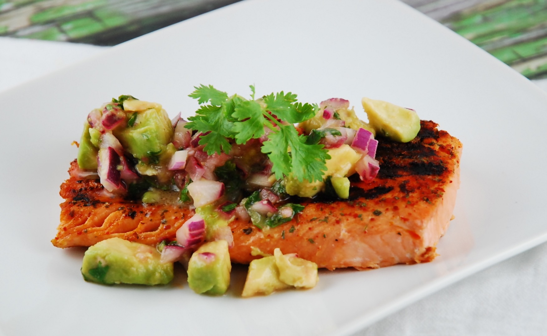 Brush salmon with a little olive oil and sprinkle with Magic Seasoning Blend. Place salmon on hot grill and grill about 5 minutes on each side turning only once until down. Place grilled salmon on platter and top with avocado salsa.