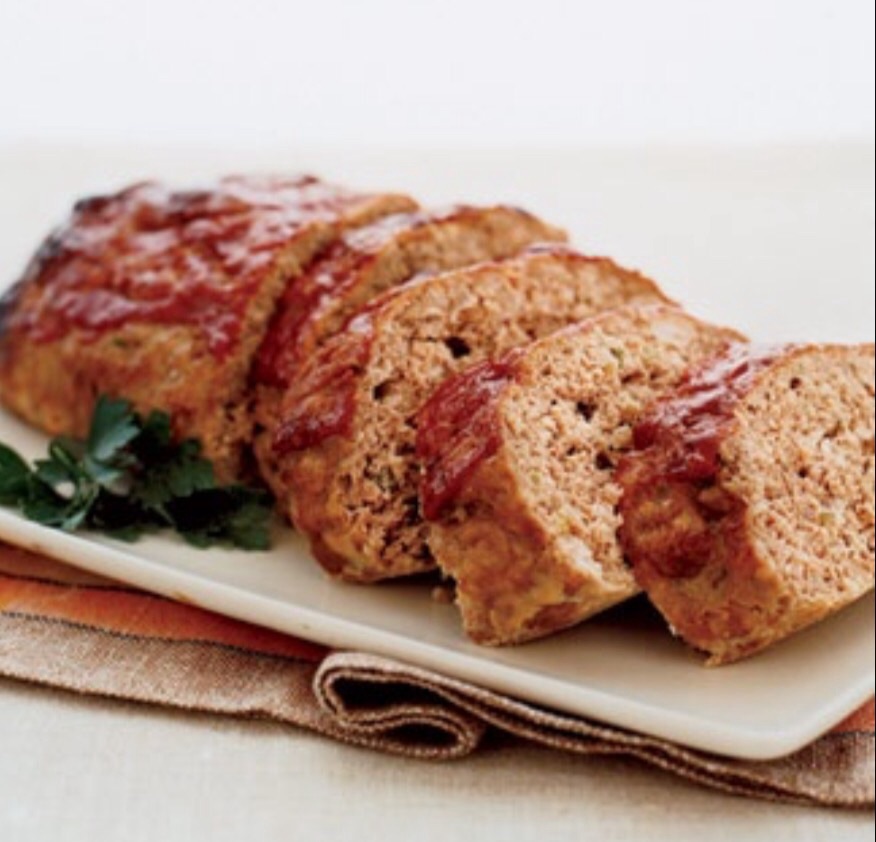 Preheat oven to 350 degrees. In large bowl combine all ingredients except mustard and ketchup mixture. Mix well. Press well into 8 x 4 loaf pan sprayed with Pam. Spread ketchup mixture on top. Bake for 1 hour. Let stand 5 minutes before serving.